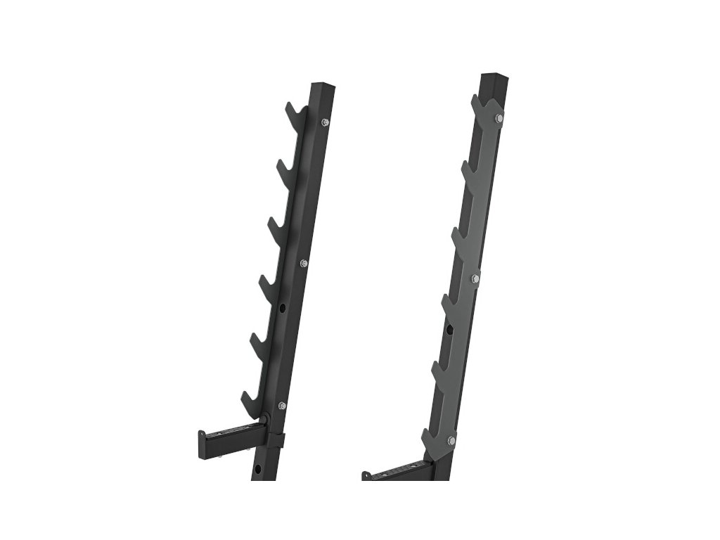 Háky na činku sú tvarované tak, aby umožnili bezpečné a pohodlné odloženie. Činku môžete odložiť ako po dokončení série, tak aj počas cvičenia, kedy je potrebná dodatočná opora. Vďaka 6 úrovniam je možné ľahko prispôsobiť výšku štartovej pozície, pričom optimálne rozostupy medzi hákmi zaručujú komfort pri zdvíhaní a odkladaní činky.