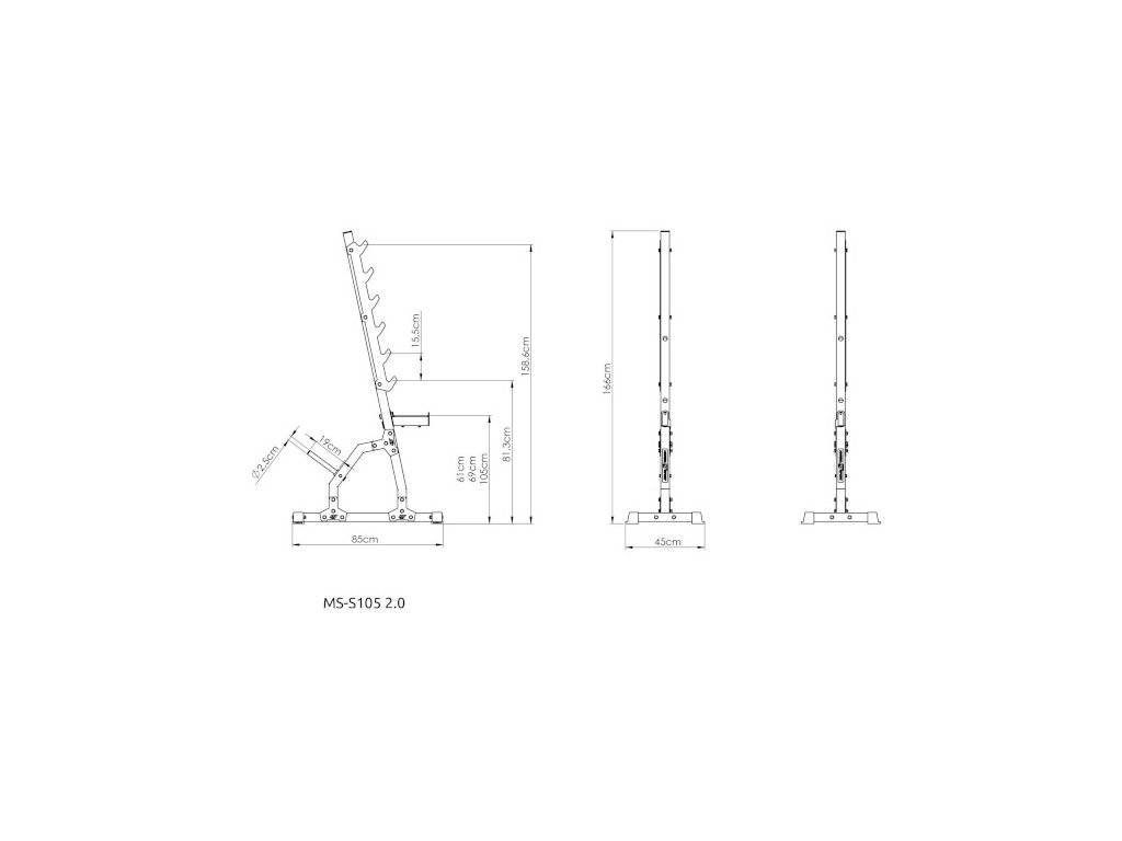 Stojany MS-S105 2.0 je možné umiestniť na akýkoľvek povrch – dlažbu, parkety alebo laminátovú podlahu. Gumové nôžky zabránia poškriabaniu podlahy a zároveň zaistia stabilitu konštrukcie, takže sa počas cvičenia nebude posúvať.