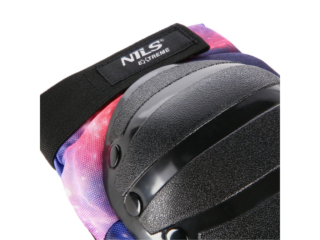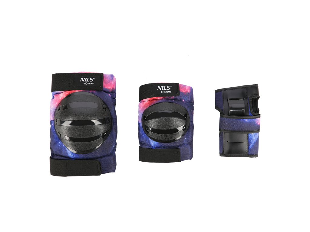 NILS Extreme H734 je sada chráničov zápästia, lakťov a kolien. Vyrobené z vysokokvalitných materiálov. Škrupina je navrhnutá z pevného a ľahkého plastu, ktorý poskytuje maximálnu ochranu zápästia, lakťov a kolien pred zranením. Všetky chrániče majú suché zipsy, ktoré chrániče udržia na mieste. H734 sú navrhnuté tak, aby sa používatelia cítili nielen bezpečne a pohodlne, ale aj štýlovo vďaka originálnym farbám a módnym vzorom.