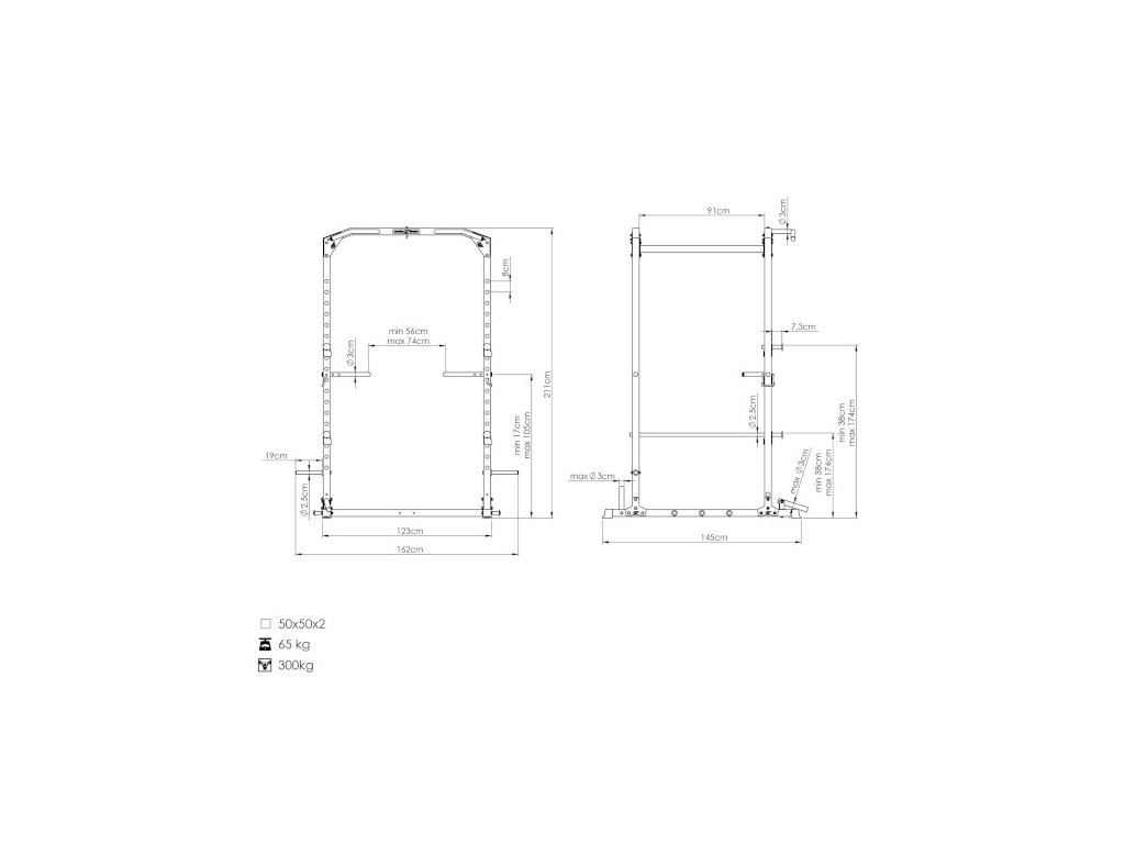 Konštrukcia je vybavená dvoma sadami výškovo nastaviteľných hákov, ktoré je možné umiestniť do 18 výškových úrovní v rozsahu 38 – 174 cm od podlahy. Vďaka tomu si jednoducho nastavíte optimálnu pozíciu pre každý cvik.
