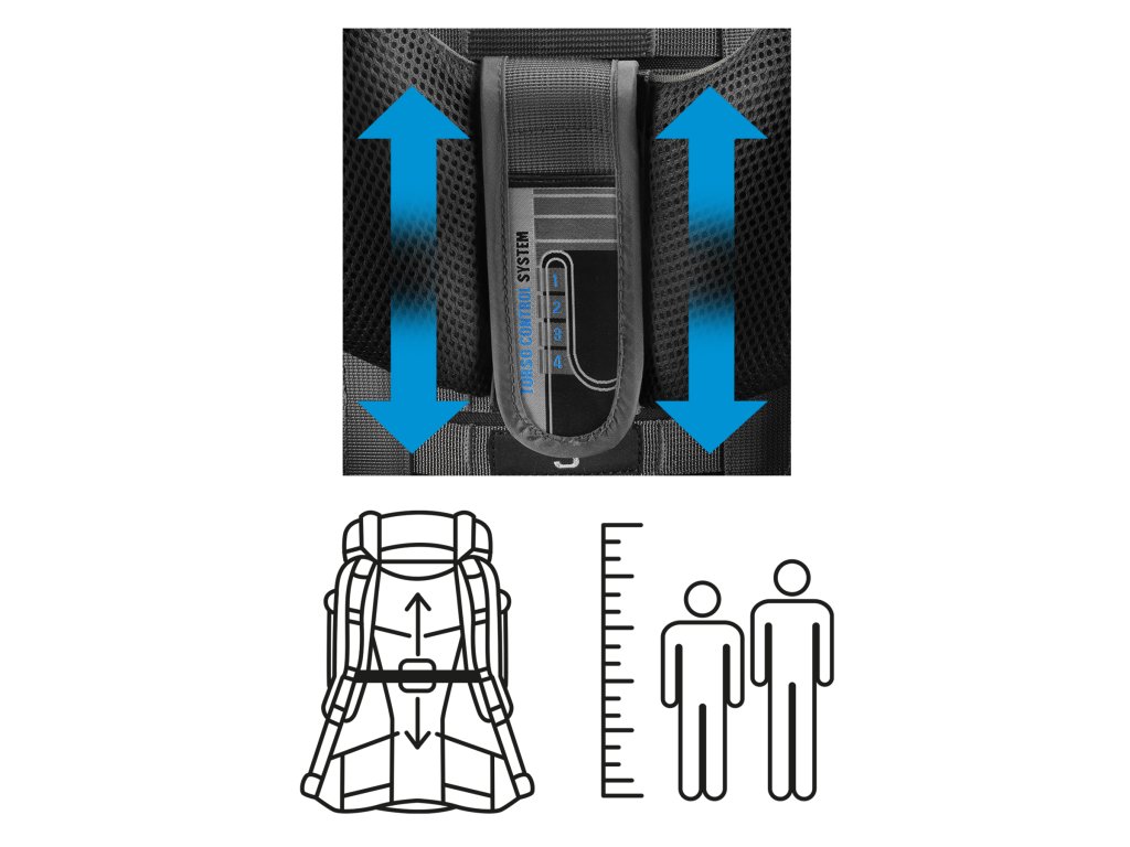 Klíčovým prvkem modelu je nastavitelný zádový systém Control TORSO, který umožňuje přesné přizpůsobení výšky zad podle postavy uživatele. Díky tomu dochází k optimálnímu rozložení hmotnosti, což výrazně zvyšuje stabilitu a pohodlí při dlouhých horských túrách.