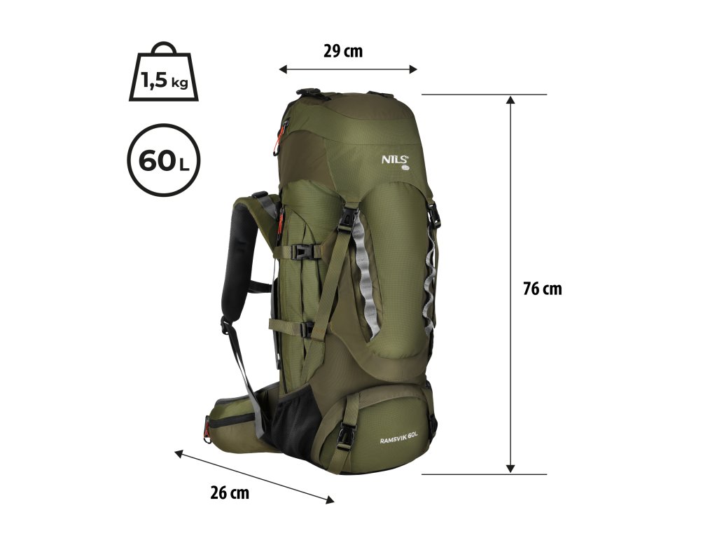 NILS Camp NC1994 RAMSVIK 60L je pokročilý turistický batoh navržený pro delší trekkingové výpravy, kempování a outdoorové cestování s kompletní výbavou. Kombinuje velký objem 60 litrů, vysokou funkčnost a komfort nošení i při vyšším zatížení.