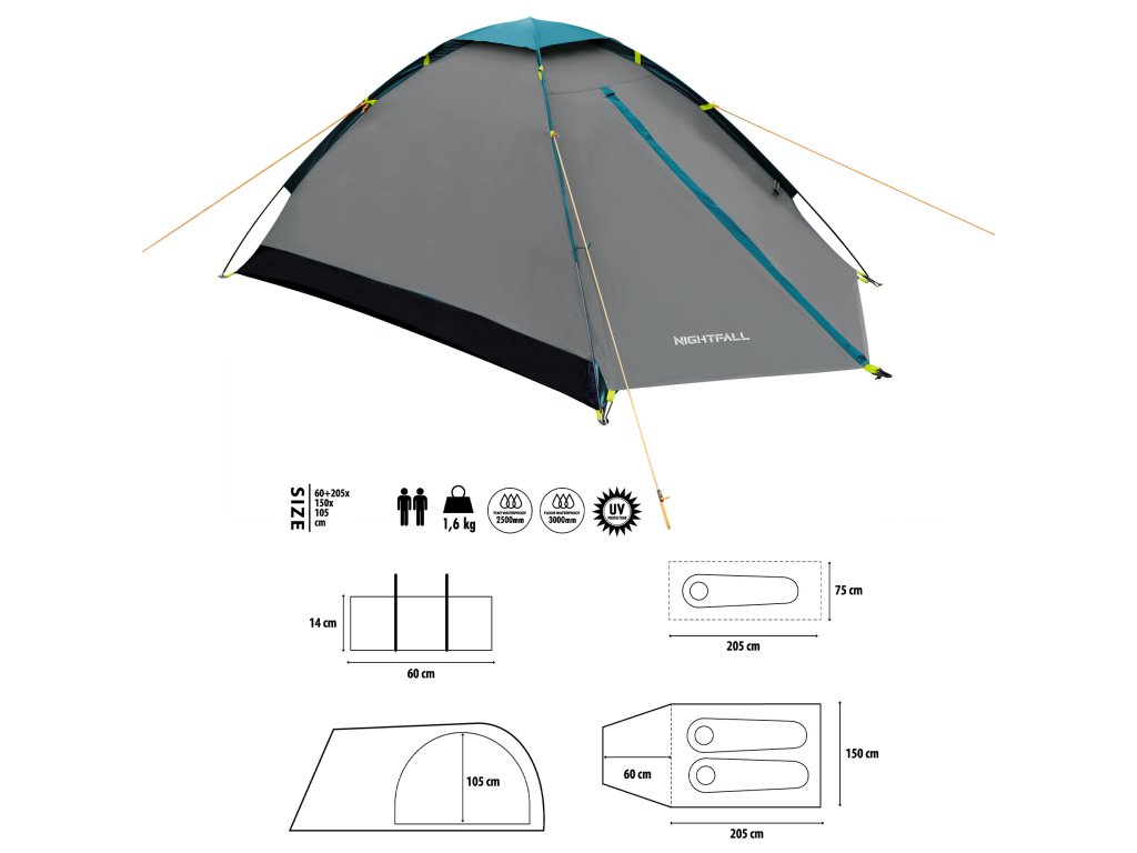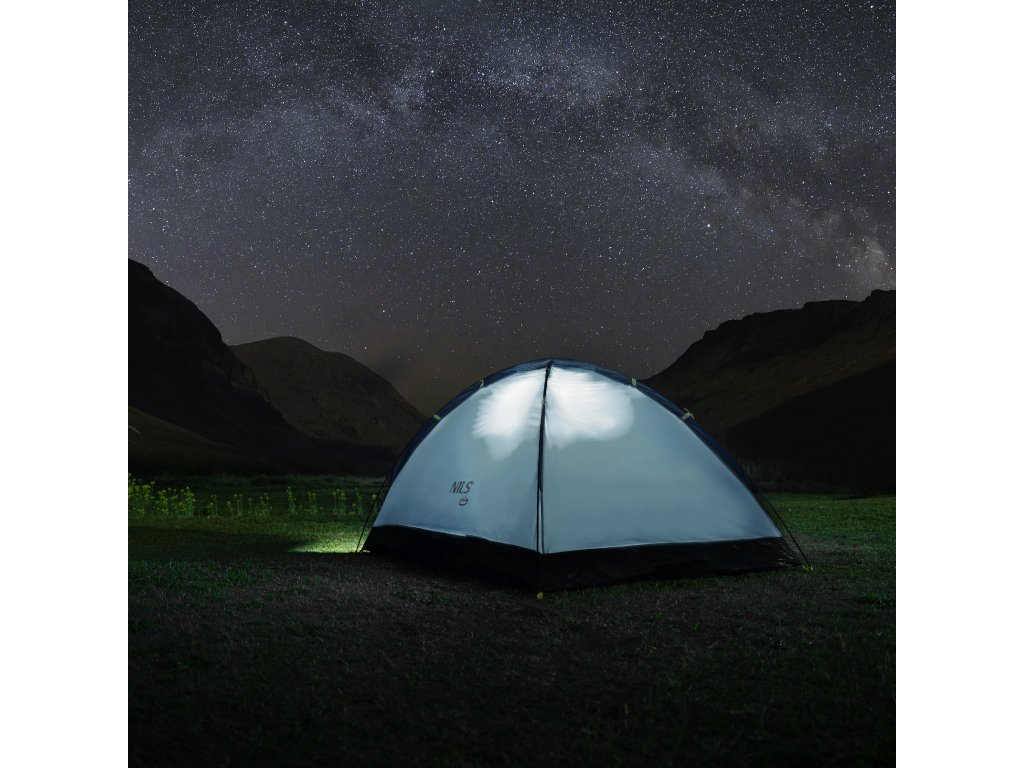 NILS Camp NC6033 Nightfall je 2 osobový, turistický stan, ktorý oceníte pri potulkách prírodou, spaní pod "širákom" alebo pri krátkom pobyte v kempe. Stan Nightfall je jenoplášťový a skladá sa z malej predsiene a spálne.