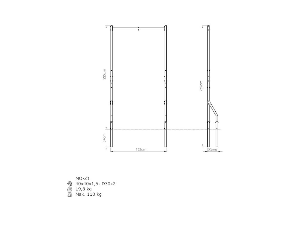 Hrazda je umiestnená vo výške 225 cm a poskytuje pohodlné uchopenie. Vďaka tomu môžete vykonávať širokú škálu silových a kondičných cvičení pre svaly hornej časti tela. Je to riešenie pre začiatočníkov aj pokročilých používateľov!