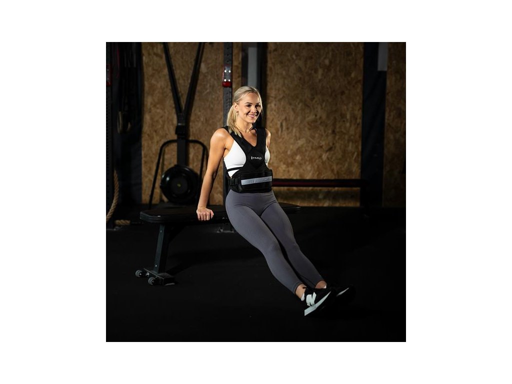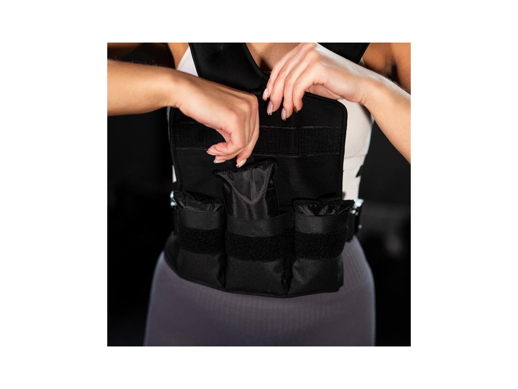 Vybavenie bolo navrhnuté s ohľadom na pohodlie užívateľa. Regulovateľné popruhy umožňujú dokonalé prispôsobenie akejkoľvek postave, a špeciálny neoprénový materiál je mäkký, odolný proti potu a zabraňuje skĺzavaniu vesty aj pri intenzívnych pohyboch. Elastické sieťované vrecko poskytuje priestor na uloženie telefónu, kľúčov alebo peňaženky, vďaka čomu sa tréning stáva ešte praktickejším.